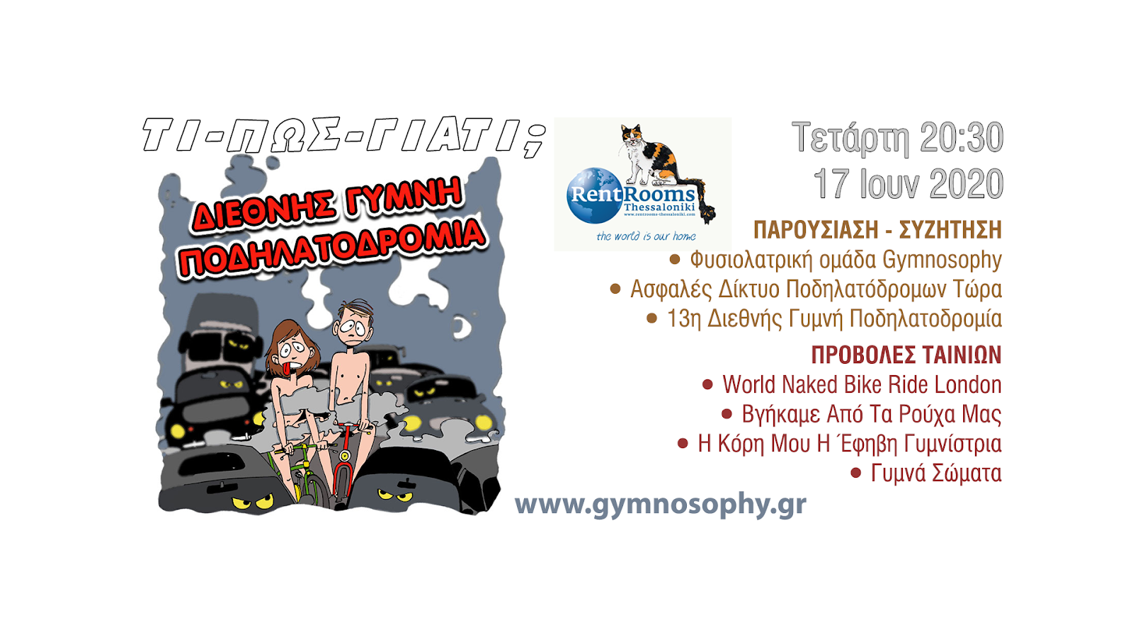 Θέλετε να εμβαθύνετε και να ενημερωθείτε για το τι είναι και γιατί γίνεται η Διεθνής Γυμνή Ποδηλατοδρομία; Τι σχέση έχει το ποδήλατο με το γυμνό σώμα, την οικολογία, τον βιγκανισμό και την μη-βία; Ποια είναι η φιλοσοφία της φυσιολατρικής της ομάδας Gymnosophy; Τι είναι η καμπάνια “Ασφαλές Δίκτυο Ποδηλατόδρομων Τώρα” και τι θέλουμε να διεκδικήσουμε για το ποδήλατο και την βιώσιμη κινητικότητα; Τι συμβαίνει στα Περιβαλλοντικά στην Ελλάδα και Παγκοσμίως;