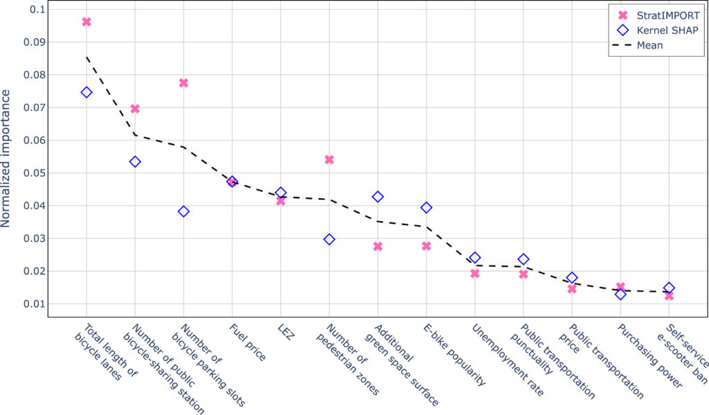 Η μεθοδολογία βασίζεται σε μεθόδους ανάλυσης ευαισθησίας που λαμβάνουν υπόψη εξαρτήσεις, όπως οι kernel SHAP και StratIMPORT. Τα αποτελέσματα δείχνουν ότι η ανάπτυξη της ποδηλασίας —και ειδικότερα το συνολικό μήκος των ποδηλατοδρόμων και η επέκταση του τοπικού συστήματος κοινής χρήσης ποδηλάτων Vélib’— αποτελούν τα πιο αποτελεσματικά μέτρα για την αύξηση του ποσοστού ποδηλασίας. Ωστόσο, σημαντικό ρόλο παίζουν και άλλες μεταβλητές, όπως οι περιορισμοί στα μηχανοκίνητα οχήματα (π.χ. η τιμή των καυσίμων και οι Ζώνες Χαμηλών Εκπομπών – LEZ) και οι πολιτικές βελτίωσης της ποιότητας ζωής (όπως οι πεζοδρομημένες ζώνες και οι χώροι πρασίνου). Αντιθέτως, τα ζητήματα που συνδέονται με τις δημόσιες συγκοινωνίες φαίνεται να έχουν μικρότερη σημασία. Αυτό υποδηλώνει ότι οι πολίτες μεταβαίνουν από τη χρήση αυτοκινήτου στην ποδηλασία κυρίως λόγω των αυξανόμενων δυσκολιών στη χρήση αυτοκινήτου και από τα δημόσια μέσα μεταφοράς προς την ποδηλασία λόγω βελτιωμένων ποδηλατικών συνθηκών. Επιπλέον, η απαγόρευση των αυτόματων ηλεκτρικών πατινιών είχε αμελητέο αντίκτυπο στη χρήση ποδηλάτων.